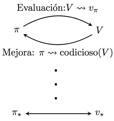 Utilizamos el término iteración de políticas generalizadas (GPI) para referirnos a la idea general de permitir que los procesos de evaluación y mejora de políticas interactúen, independientemente de la granularidad y otros detalles de los dos procesos.